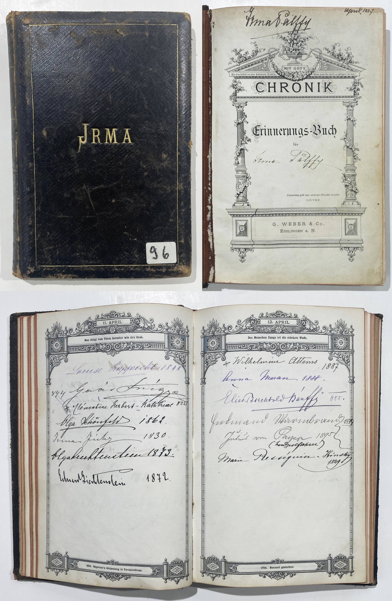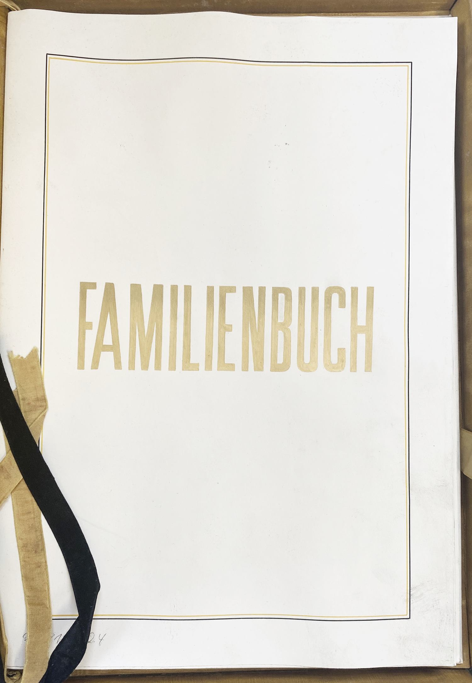 Die Lederschatulle mit 3 von urspünglich 4 Messing-Bierbeschlägen am unteren Boden. Schatulle etwas berieben, untere Seite der Schatulle beidseitig eingerissen – das Familienbuch sehr gut erhalten.
