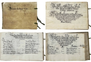 "Deren von der Bürger Stuben / Der Herren Geschlechter Hoch-zeitt Büech, so auff die Bürger Stuben gehoeren. Welches Angefangen worden A[nn]o 1484 darin alle deroselben herrn und Frauen Tauff und zuenamen specificiert und begriffen, auch zue Edlrn Auffne[m]men, und Langwürigem angedencken auffs newe zusamen getragen. So vor diser Zeitt niemals als gebräuchig oder im Wercks gewesen. Anno D[omin]i 1621“ (Augsburg), 1621-1623. Qu-8vo [ca. 16 x 20,5 cm]; 120 num. Bl.; (10) nn. Bl., 116 nn. Bl. (Register), (5) nn Bl. -- Handschrift in brauner und schwarzer Tinte.
