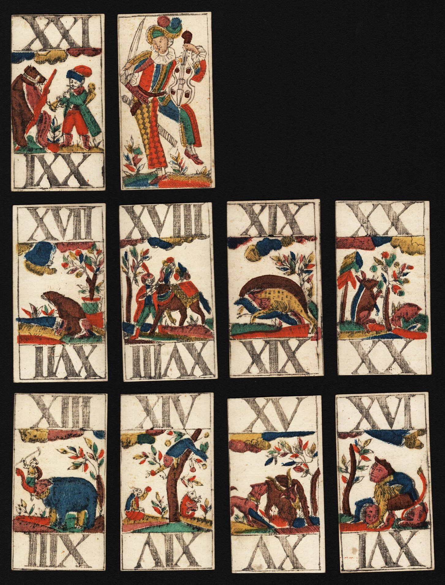 Very rare deck that features unique illustrations of various animals – sometimes accompanied by a person – such as: lion, unicorn, colorful birds, deer, wild cats, camel, elephant, a human-faced monkey, etc. The animal cards stand out as the most creative aspect, blending the symbolic richness of Tarot with nature-inspired depictions. The inclusion of a variety of animals, from mythical creatures like unicorns to real ones like lions and peacocks, highlights the deck’s cultural and artistic significance. The deck was most likely inspired by the Bavarian animal tarot cards by Andreas Benedict Göbl (c. 1765). — in very good condition.