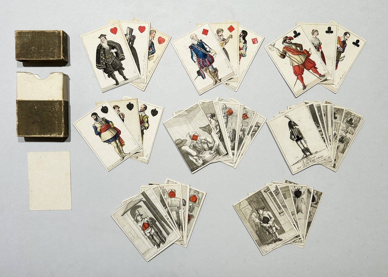 52/52 playing cards. 97 x 68mm; Handcoloured-etching. – Back cover white. In a contemporary cardboard slipcase. – Slipcase slightly rubbed – otherwise very well preserved. — Without the almanac.